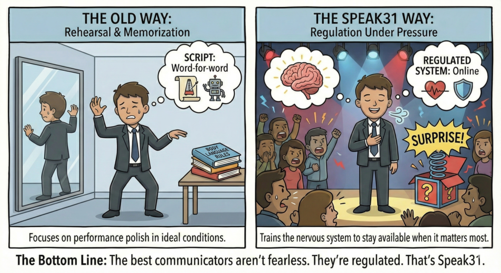 Speak31 is a live, science-backed module-based communication training system that conditions the nervous system to perform under pressure. Instead of scripts or memorization, it uses real-time practice to build calm, clarity, and confidence when it matters most. Learn more or experience a live session at speak31.com.